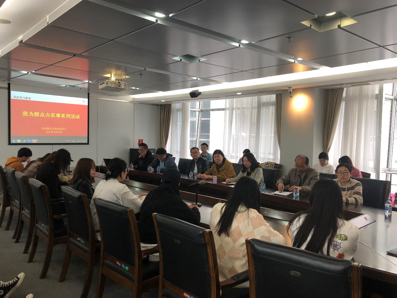 为深入贯彻习近平总书记在党史学习教育动员大会的重要讲话精神,深刻把握习近平新时代中国特色社会主义思想的精神实质、实践要求和为民情怀,进一步增强党员和师生学思践悟新思想的自觉,马克思主义党总支近日开展了“我为群众办实事”教工支部与学生面对面实事工程活动。学院党总支书记戴叶萍,教工第一党支部书记周林、第二党支部书记陆益军、第三党支部书记陈健,以及各教工支部代表教师和学院全体研究生参加此次活动。活动由beat365中文官方网站党总支书记戴叶萍主持。