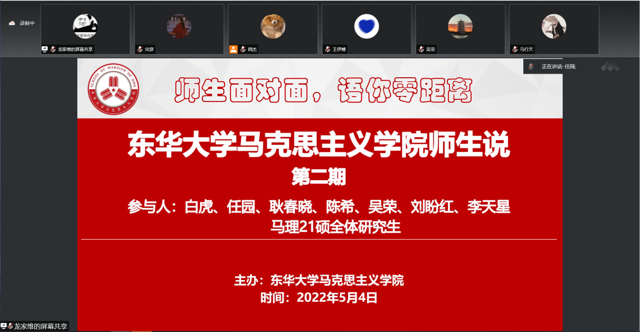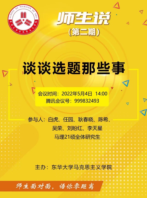 5月4日,正值五四青年节,beat365中文官方网站举行了“师生说”系列主题活动第二期——“聊聊选题那些事”。本期主题活动由白虎、任园、耿春晓、陈希、吴荣、刘盼红、李天星七名青年教师与马理21硕全体研究生在云端面对面、零距离共话成长。
